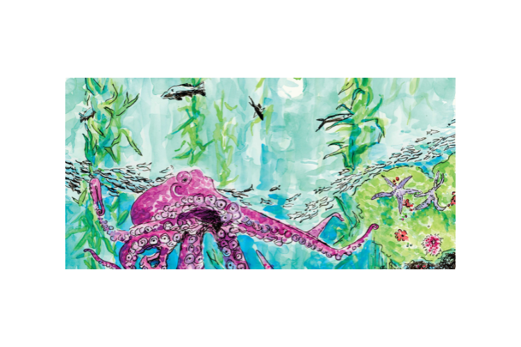 In the kelp forest, the venerable octopus lives in community with sea urchins, sea stars, and a wide range of fish. For many fish and mammals, kelp forests provide literal shelter in the storm. Teeming with tiny life, they also provide food for birds including gulls, crows, great blue herons, and cormorants. These underwater forests absorb massive amounts of carbon dioxide and protect shorelines from erosion: “They are a green belt that connects us all.” (Future Ecologies) This painting and write-up provide only a glimpse of the complex ecosystems of the kelp forests and their role in planetary survival. They are a beautiful illustration of how we are all interconnected, and they need our attention and conservation efforts.